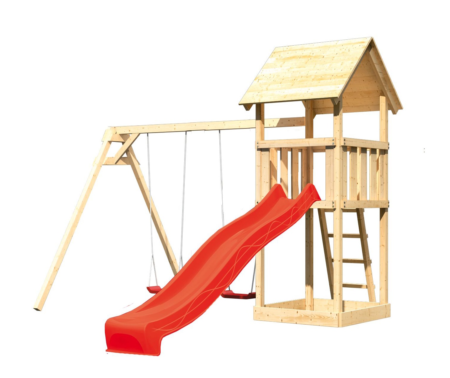 Detské ihrisko KARIBU LOTTI poskytuje deťom veľa možností k hrám. Ponúka všetko k tomu, aby deti mohli prežiť všetky svoje hracie fantázie. Rovnako ako u všetkých našich detských ihrísk aj pri modeli KARIBU LOTTI používame výhradne to najlepšie smrekové drevo. Ihrisko má nosné stĺpy s hrúbkou 68 x 68 mm a je vyrobené z drevených profilov o sile 18 mm (spoje v systéme pero / drážka). Naše drevo pochádza zo vzdialeného severu Európy a je chemicky úplne neošetrené. V dôsledku toho je prosté všetkých známych problematických látok. Vďaka výške plošiny 125 cm ponúka ihrisko KARIBU LOTTI deťom dokonalý výhľad na záhradu. Ihrisko je štandardne vybavené robustným dreveným rebríkom so 4 priečkami a pieskoviskom pod vežou. Detské ihrisko KARIBU LOTTI má samozrejme certifikát TÜV Nord overujúci bezpečnosť výrobku (GS) podľa DIN EN 71-1, DIN EN 71-3, DIN EN 71-8 a AfPS GS 2014.